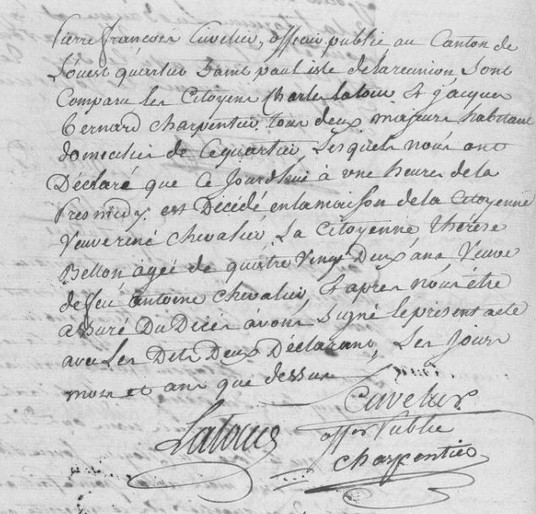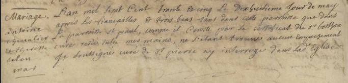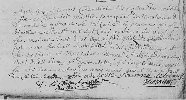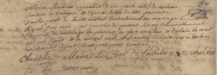 Le 15 février 1752, à l'âge de 47 ans, il assiste au mariage de sa fille, mon aïeule Thérèse Suzanne Chevalier, à Sainte-Marie. Elle s'unit à Yves Le Bègue, un breton, scellant ainsi l'avenir de la lignée sur cette terre d'accueil. Ce mariage, célébré dans le quartier où Antoine a fini par fixer ses affaires, marque l'aboutissement social de son parcours d'exilé.