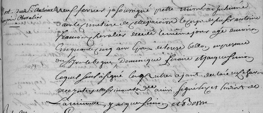 C'est dans cette même paroisse de Sainte-Marie, seulement deux semaines après avoir vu sa fille s'établir, qu'Antoine François Chevalier s'éteint. Il décède le 29 février 1752, en cette année bissextile, à l'âge de 47 ans.