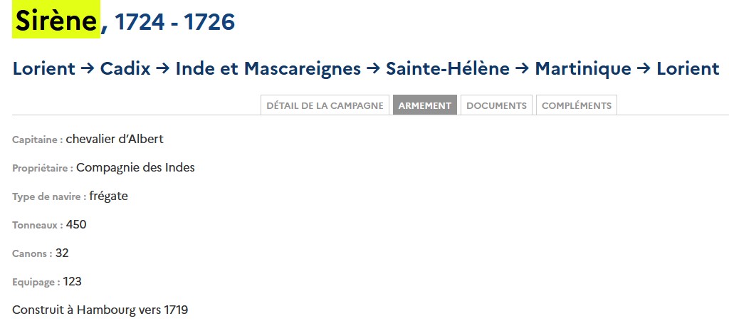 Équipage : 123 hommes sous le commandement du Chevalier d'Albert.