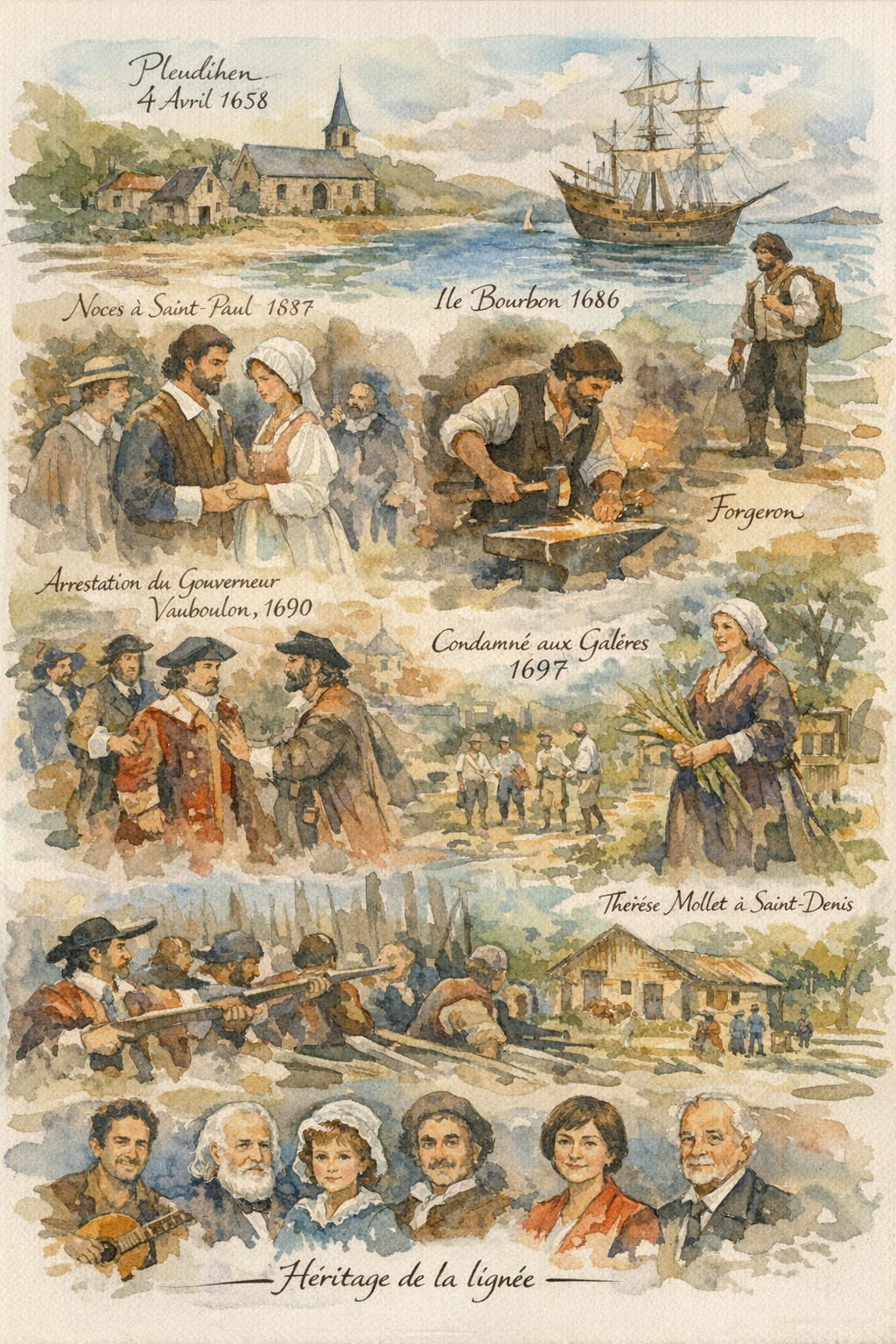 Ce fut donc en novembre 1686 que Robert posa le pied sur la terre de l'île Bourbon, débarquant du navire le Saint François d'Assise. D'abord établi aux Sables à Saint-Paul, Robert y exerça son métier de forgeron. Un an plus tard, le 14 mars 1687, à Saint-Paul, il unissait sa destinée à celle de Thérèse MOLLET (Sosa 1319), née également à Saint-Paul en 1673. Fille de Claude MOLLET (Sosa 2638) et Jeanne de la Croix (Sosa 2639), Thérèse avait pour parrain le célèbre Jacob de La Haye, une figure majeure de l'expansion coloniale française du XVIIe siècle. Amiral et directeur de la Compagnie française des Indes orientales, Jacob de La Haye fut l'architecte des premières tentatives françaises de colonisation à Madagascar et de l'affirmation de la présence française dans l'océan Indien dès les années 1670. Cette prestigieuse parenté spirituelle conférait à la naissance de Thérèse une dimension déjà ancrée dans le destin de l'île.