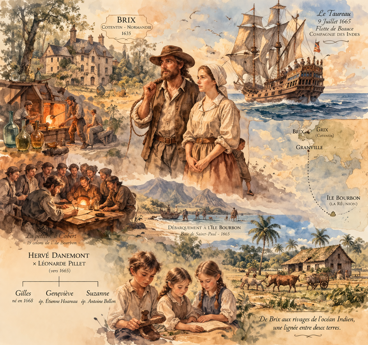 Parti des forêts de Brix pour les rivages de l'océan Indien, Hervé Danemont est le point de départ d'une lignée qui s'est ancrée à l'île Bourbon. Malgré les lacunes administratives de l'époque, notamment l'absence d'actes de mariage ou de sépulture pour Hervé et Léonarde, les récits et les recensements permettent de retracer le parcours de cette famille. De l'ouvrier verrier normand au propriétaire terrien de Saint-Paul, l'histoire des Dennemont témoigne de l'installation des premières familles sur l'île. Ce récit, qui unit désormais mes lignées paternelle et maternelle, constitue la trace historique de mes origines entre la Normandie et la Réunion.