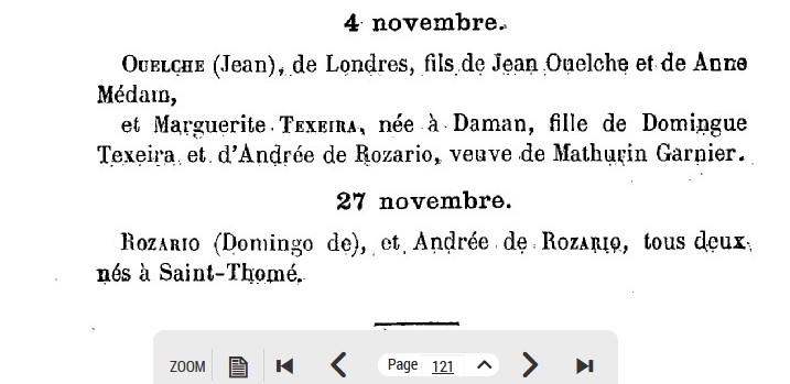 À la page 121, il est explicitement indiqué que Marguerite Teixeira, sœur d'Emmanuel, est bien la fille de Domingos (ou Domingue) Teixeira et d'Andrée do Rosario. Cette filiation confirme l'appartenance de Marguerite et d'Emmanuel à la famille Teixeira da Mota.