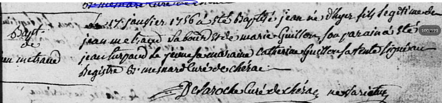 Jean METRAU naît le 16 janvier 1756 à Chérac, en Charente-Maritime, au cœur de l'ancienne province de Saintonge. Il est baptisé le lendemain, conformément aux usages de l'époque, en présence de son parrain Jean Turpaud et de sa marraine Catherine GUILLON, sa tante. Il est le fils de Jean METRAU et de Marie GUILON/GUILLAU, appartenant à cette paysannerie rurale qui constituait l'essentiel de la population locale au XVIIIᵉ siècle.