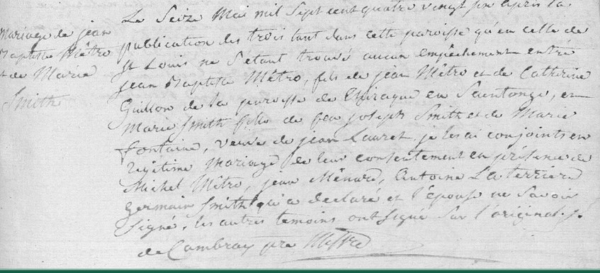 Marie SMITH se remarie en troisièmes noces le 19 novembre 1802 avec Louis-Simon LEFEVRE, à Saint-Pierre.