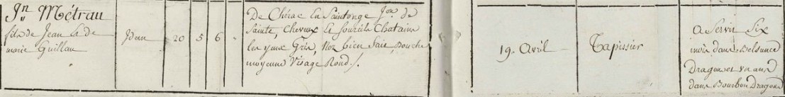 Les recherches effectuées dans les registres des contrôles et des matricules, consultables sur le site Mémoire des hommes, permettent de dresser un portrait précis de Jean METRAU. Fils de Jean et de Marie, il est originaire de Chérac, dans la juridiction de Saintes. Les signalements de l'époque nous décrivent un homme au visage rond, doté de cheveux et de sourcils châtains, d'yeux gris, d'un nez bien fait et d'une bouche moyenne.