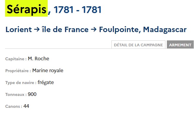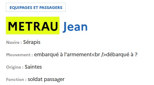 C'est précisément ce dernier passage qui retient l'attention : sur le site de la Mémoire des hommes en 1781, Jean METRAU est signalé comme soldat embarqué depuis Saintes à destination de l'Île de France à bord du navire Sérapis. Cette date de 1781 correspond à la période d'un an de service mentionnée dans le corps d'élite. Ce départ vers les Mascareignes, mis en perspective avec son mariage célébré en 1786, coïncide parfaitement avec la période où sa présence est attestée à l'Île Bourbon. Cette convergence chronologique et géographique permet raisonnablement de conclure qu'il s'agit d'un seul et même individu.