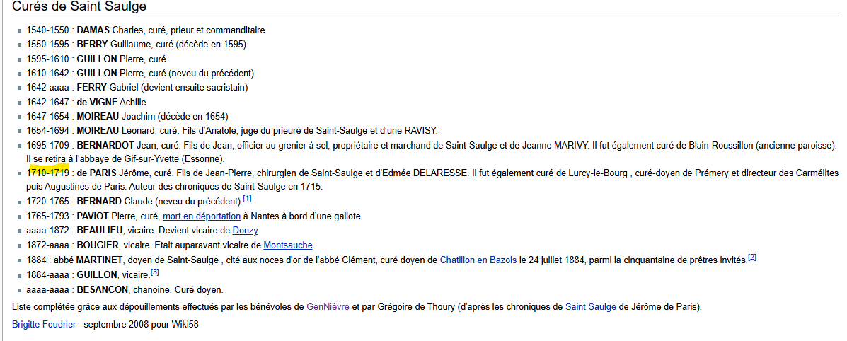 J'ai ainsi appris que la famille DEPARIS ou DE PARIS était établie depuis longtemps dans la Nièvre, à Saint-Saulge. Les parents de Gabrielle DEPARIS (Sosa 2241) étaient Claude DEPARIS (Sosa 4482), chirurgien et poète, et Antoinette CAMUS (Sosa 4483), accoucheuse de profession. Claude était le fils de Jean DEPARIS (Sosa 8964) le jeune et de Perrette D'HERE (8965). Il avait un frère, Simon, qui avait quitté le pays, et deux sœurs qui avaient épousé les deux fils DELAVENNE ou DE LAVENNE OU DELAVEYNE et nous reviendrons un peu plus loin sur le parcours du fils de Jeanne.