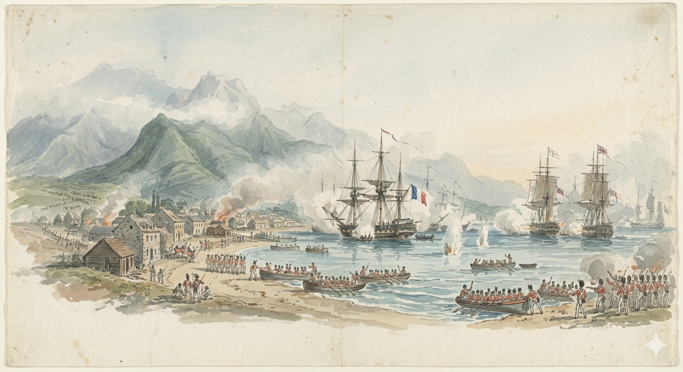 Lorsque les bâtiments britanniques apparurent à l'horizon, leur manœuvre fut d'une précision redoutable. L'attaque ne se limita pas à un affrontement naval ; elle fut conçue comme une opération combinée, exploitant les faiblesses du terrain et la désorganisation des défenses. Les troupes débarquèrent rapidement, contournant les positions françaises, prenant les batteries à revers, semant la confusion avant même que la résistance ne puisse véritablement s'organiser.