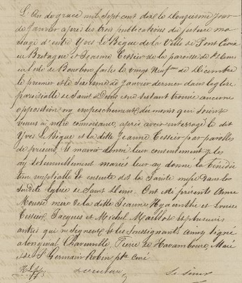 C'est dans ce climat contrasté, entre procédures successorales et dettes persistantes, que naît à Sainte-Marie, le 23 novembre 1752, mon aïeule Jeanne Suzanne LE BEGUE, fille d'Yves et de Thérèse Suzanne Chevalier.