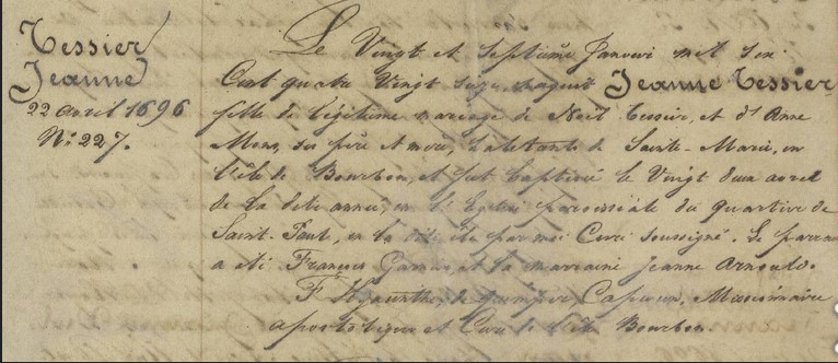 P.-S. : Contrairement à l'absence ou aux différentes dates non sourcées que l'on peut trouver sur Geneanet, la date de décès indiquée de Jeanne Tessier épouse Le Bègue ici est la seule exacte. Elle est certifiée par son acte de décès, consulté aux AD 974 - Sainte Marie - année 1738 (vue 46).