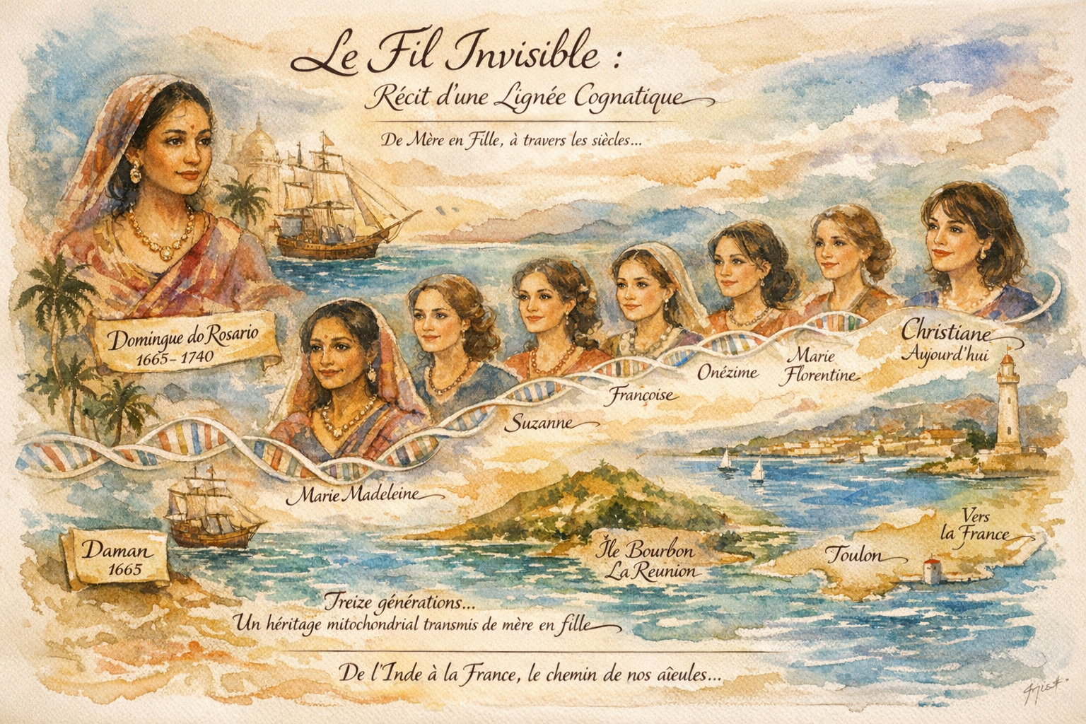 Par son mariage avec mon père, ma mère a transmis une dernière fois ce précieux héritage. Ce voyage entamé par Domingue sur la côte Malabar, poursuivi pendant trois siècles à la Réunion, a fini par traverser l'océan pour atteindre les rives de la Méditerranée. C'est à Toulon que je suis née, recevant ce témoin séculaire, et je suis aujourd'hui le 13e maillon de cette chaîne de vie ininterrompue.