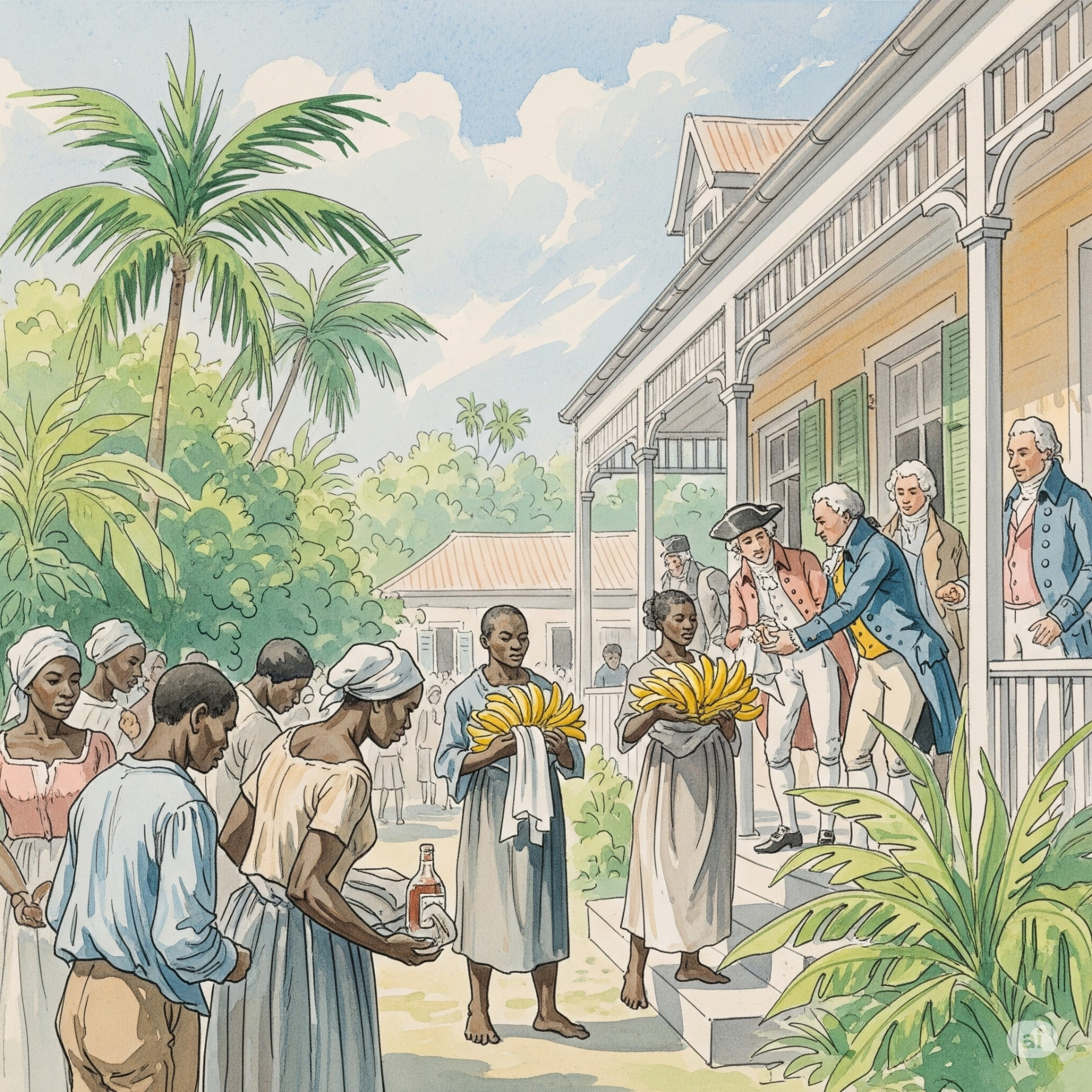 Le 1er janvier, les esclaves se rendaient chez leurs maîtres pour souhaiter la bonne année. En échange, ils recevaient parfois quelques bananes, un vêtement ou un peu de rhum. Cette prétendue générosité n'était qu'une façade : elle servait à donner l'image de maîtres bienveillants, alors que le système restait profondément injuste.