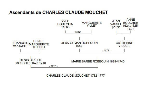 Charles Claude était le fruit de l'union de Denis Claude MOUCHET (Sosa 424) et de Marie Barbe ROBEQUIN (Sosa 425). Son père, Denis Charles, avait vu le jour à Paris le 6 janvier 1678, et fut baptisé le lendemain en la paroisse Saint-Gervais, fils de François MOUCHET (Sosa 848) et de Denise Marguerite THIBERT (Sosa 849). Le 16 septembre 1713, il unissait sa destinée à celle de Marie Barbe ROBEQUIN, sous l'égide d'un contrat de mariage rédigé par le notaire parisien Louis LARSONNIER. Denis Charles embrassa d'abord le métier d'aubergiste, avant de devenir compagnon orfèvre, ainsi que le révèle son acte de décès daté du 8 juin 1748. Il s'éteignit à l'âge de soixante-dix ans, et fut inhumé le lendemain, en présence de ses fils, Charles et Claude Charles MOUCHET, ainsi que de ses cousins, Charles Louis et Charles SPIRE.