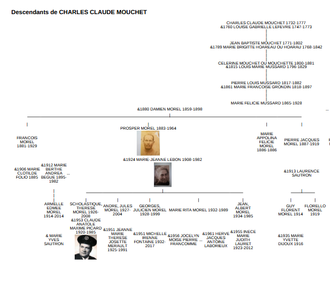 Célerine, quant à elle, se maria par deux fois : d'abord avec Louis Marie MUSSARD (Sosa 52), avec qui elle eut plusieurs enfants, dont Pierre Louis MUSSARD (Sosa 26), puis, après le décès de son premier époux, avec Louis LEBON. Elle s'éteignit à l'âge de 81 ans, au terme d'une longue vie marquée par la résilience et la transmission.